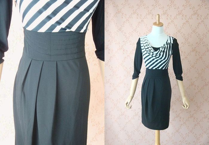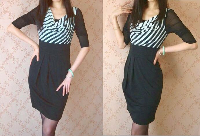 春ワンピース ワンピース 春 七分袖 ストライプ タイト 膝丈 ミディアム タイトワンピース ストライプワンピース タイトワンピ スレンダー 20代30代40代 大人セクシー シースルー袖 透け感 大人の女性 OL エレガント ドレープネック 旅行 持ち運び 黒 ブラック
